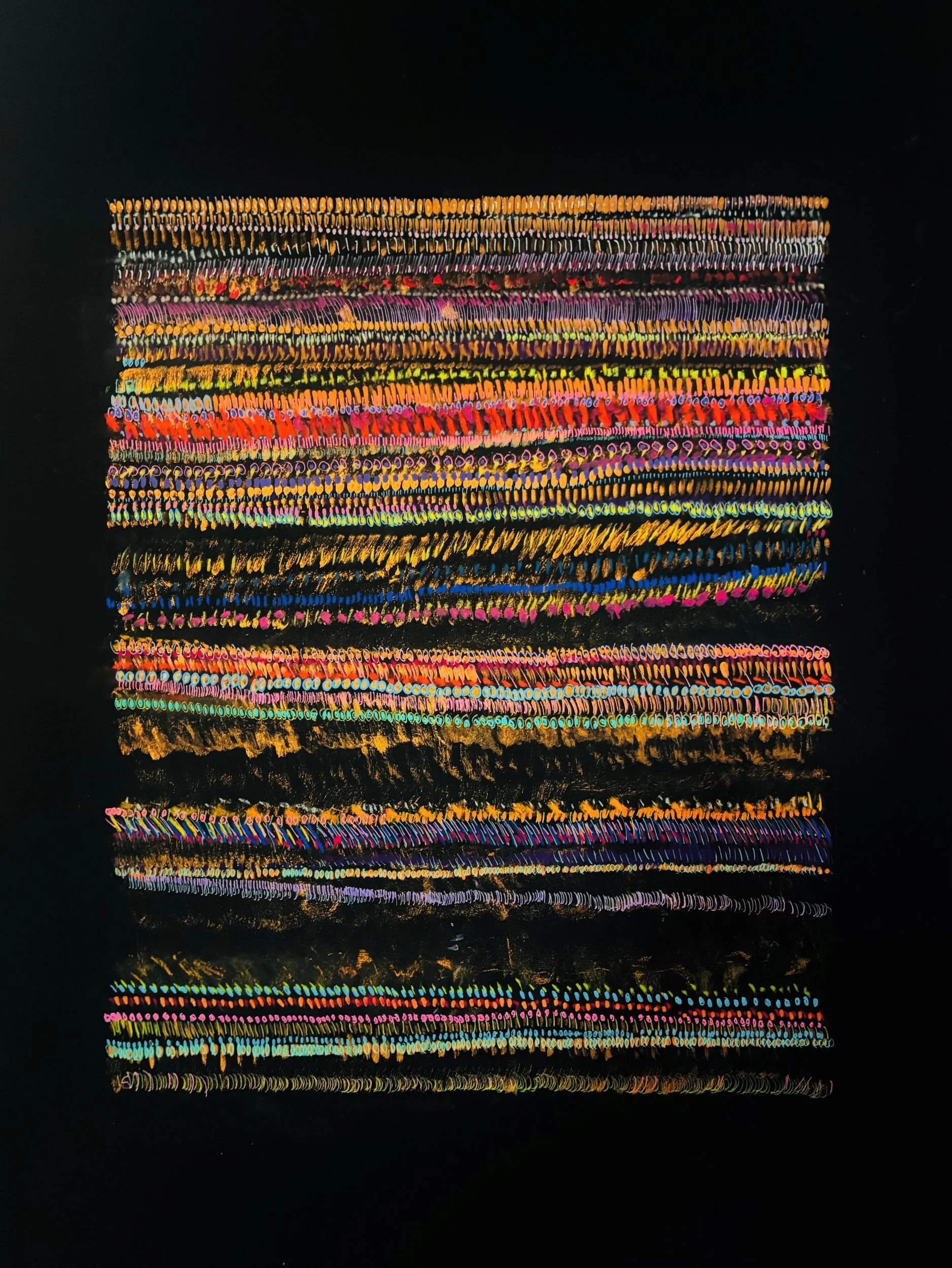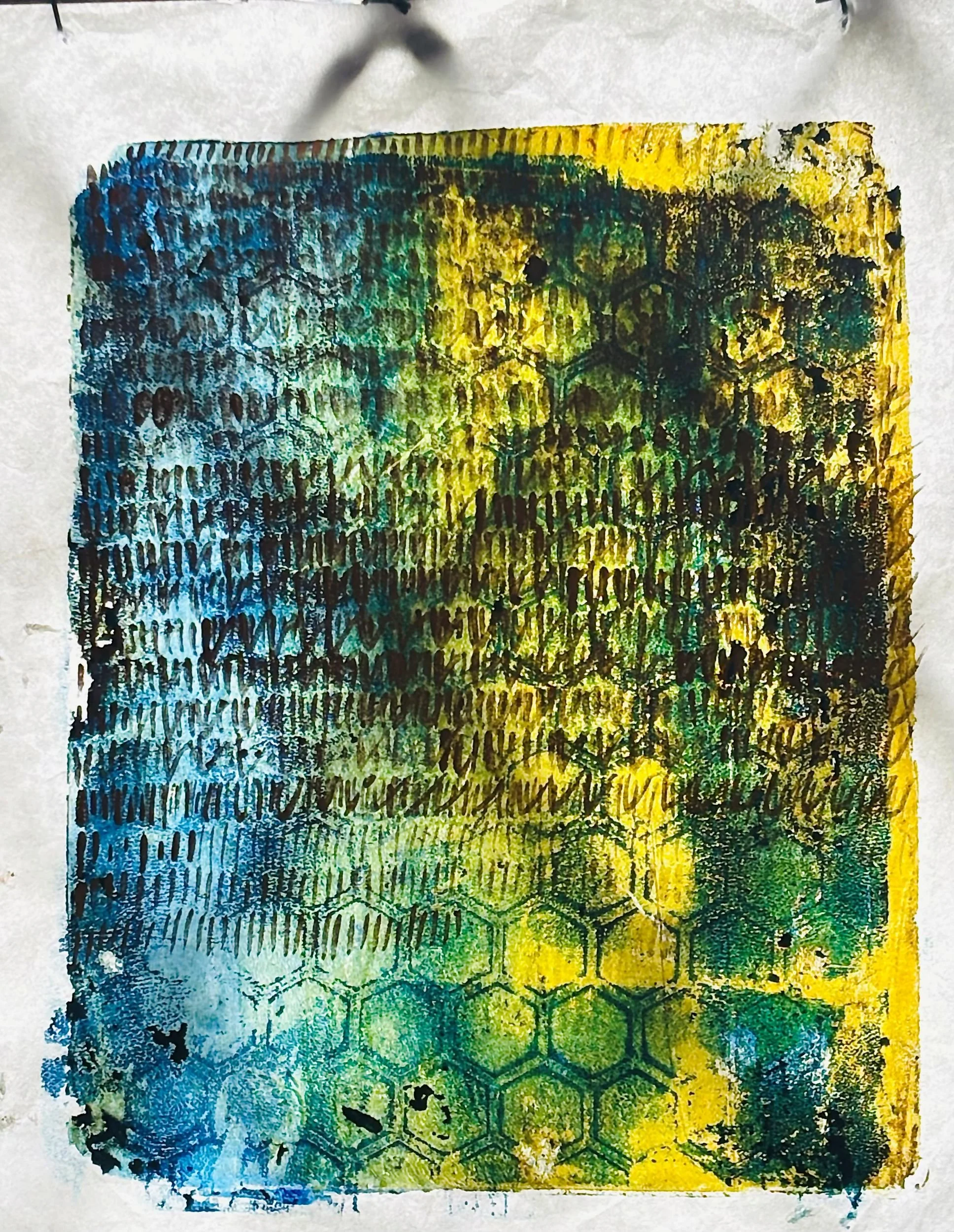 Monoprinting onto transparent Japanese rice paper, then working on the multi-layered surface with gold ink and soft pastels.